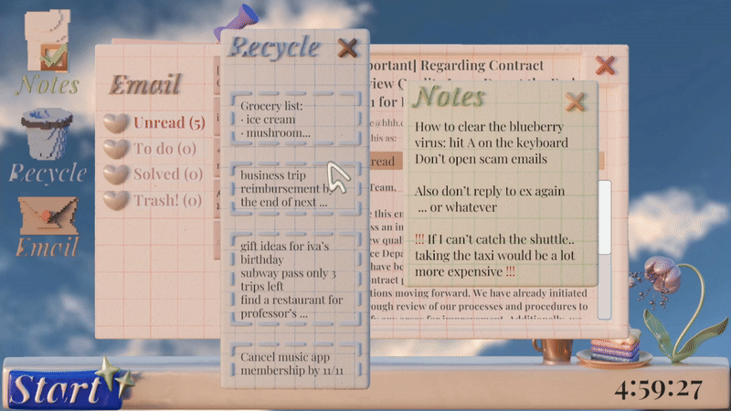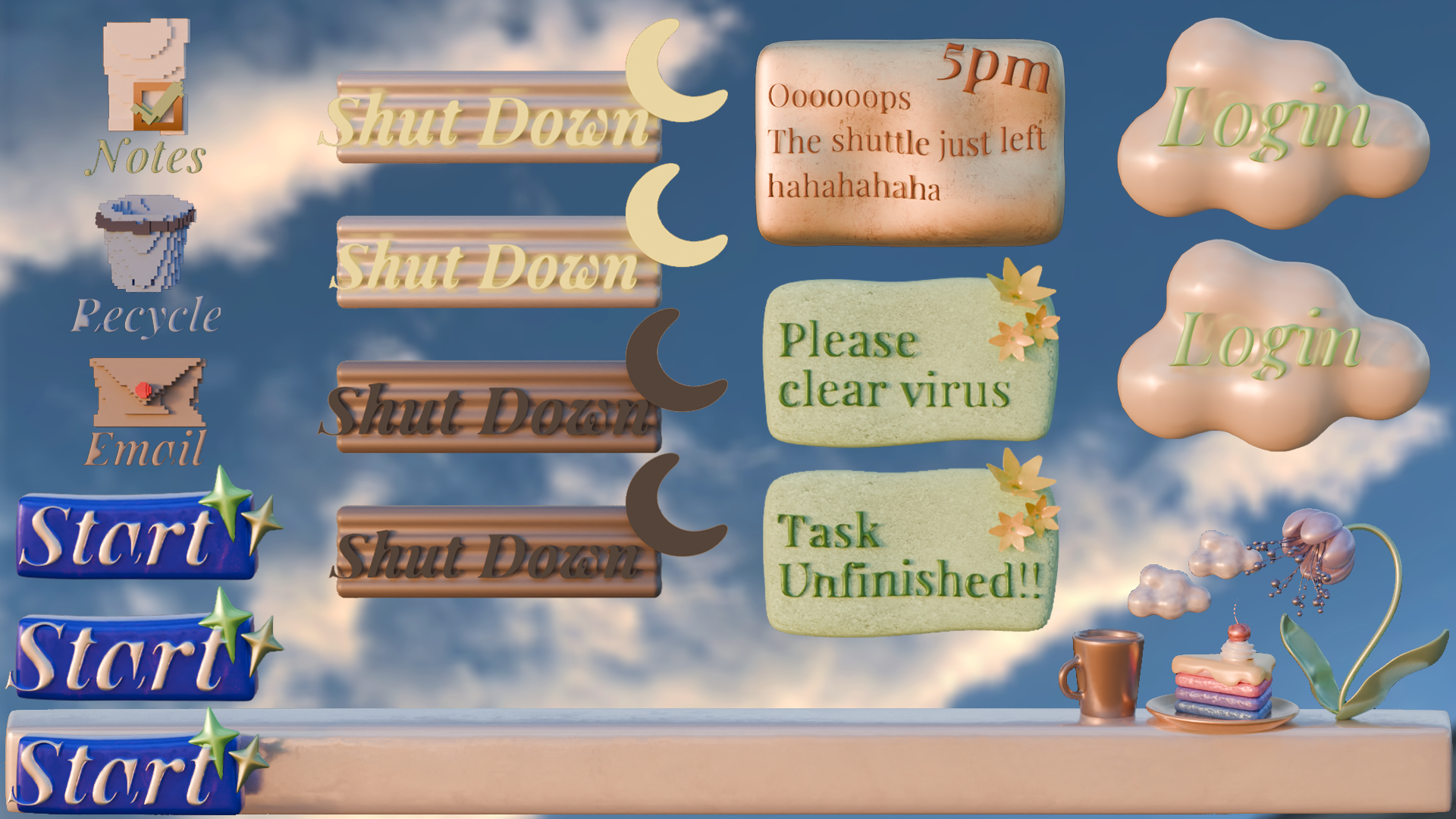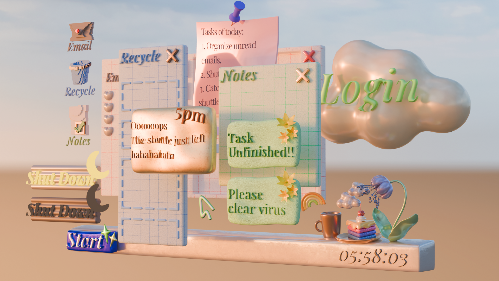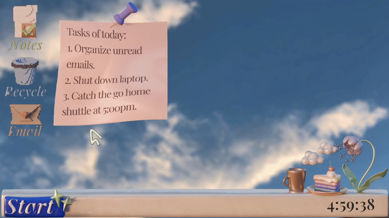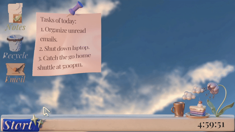 “The Last Moment of Nine to Five” is a desktop game built in Unity. The player will explore and perform tasks on a computer screen in order to complete the login – interact – shutdown process. There is a time limit to the game, but going beyond the limit does not affect the overall experience.