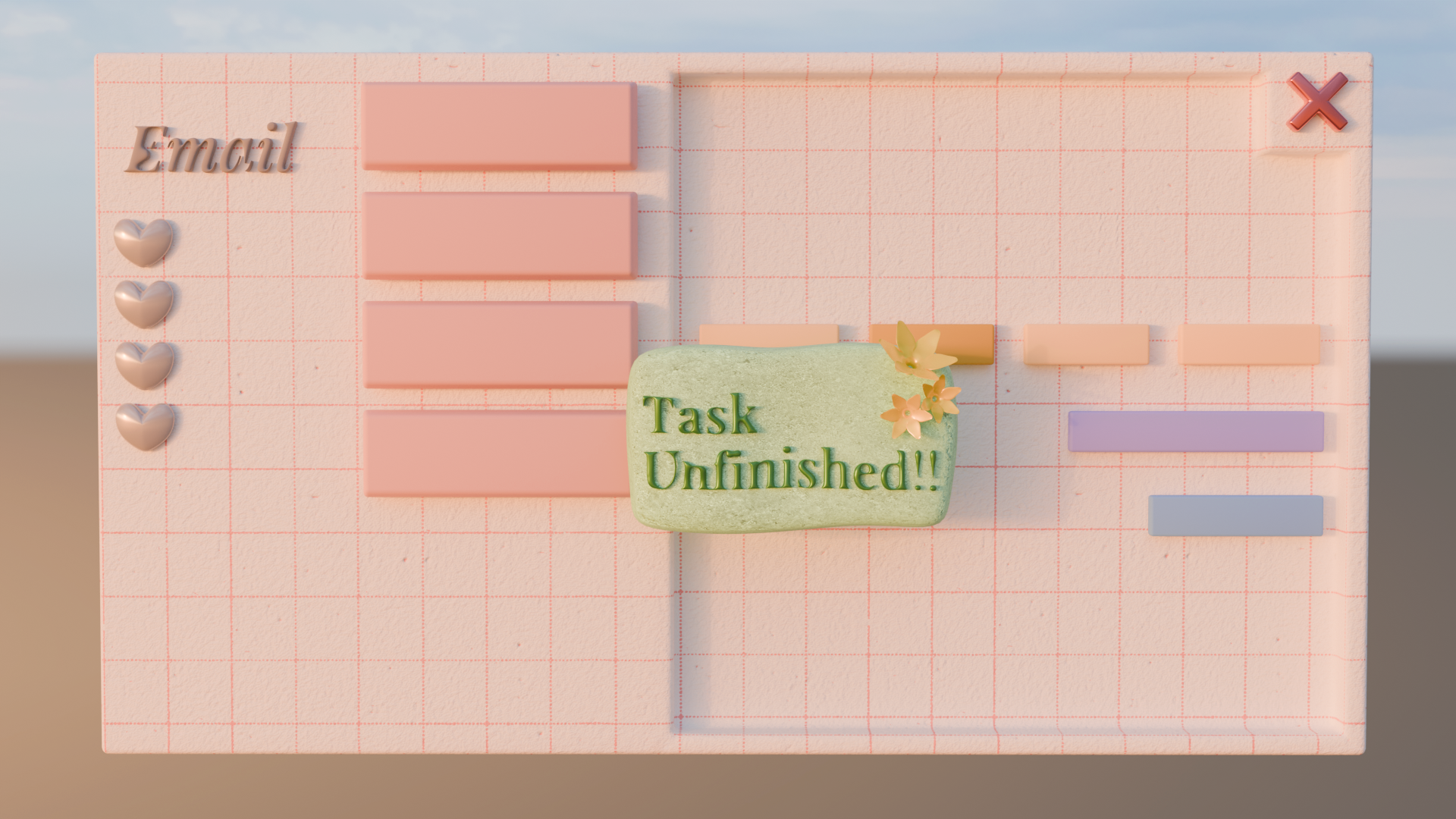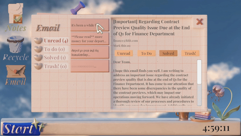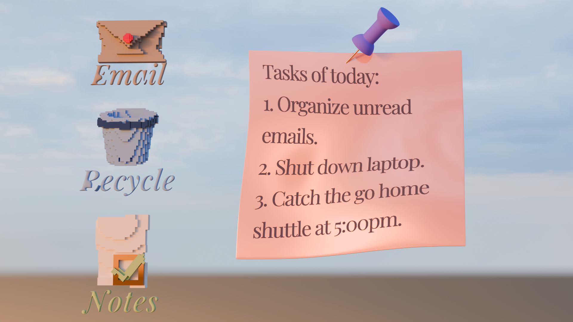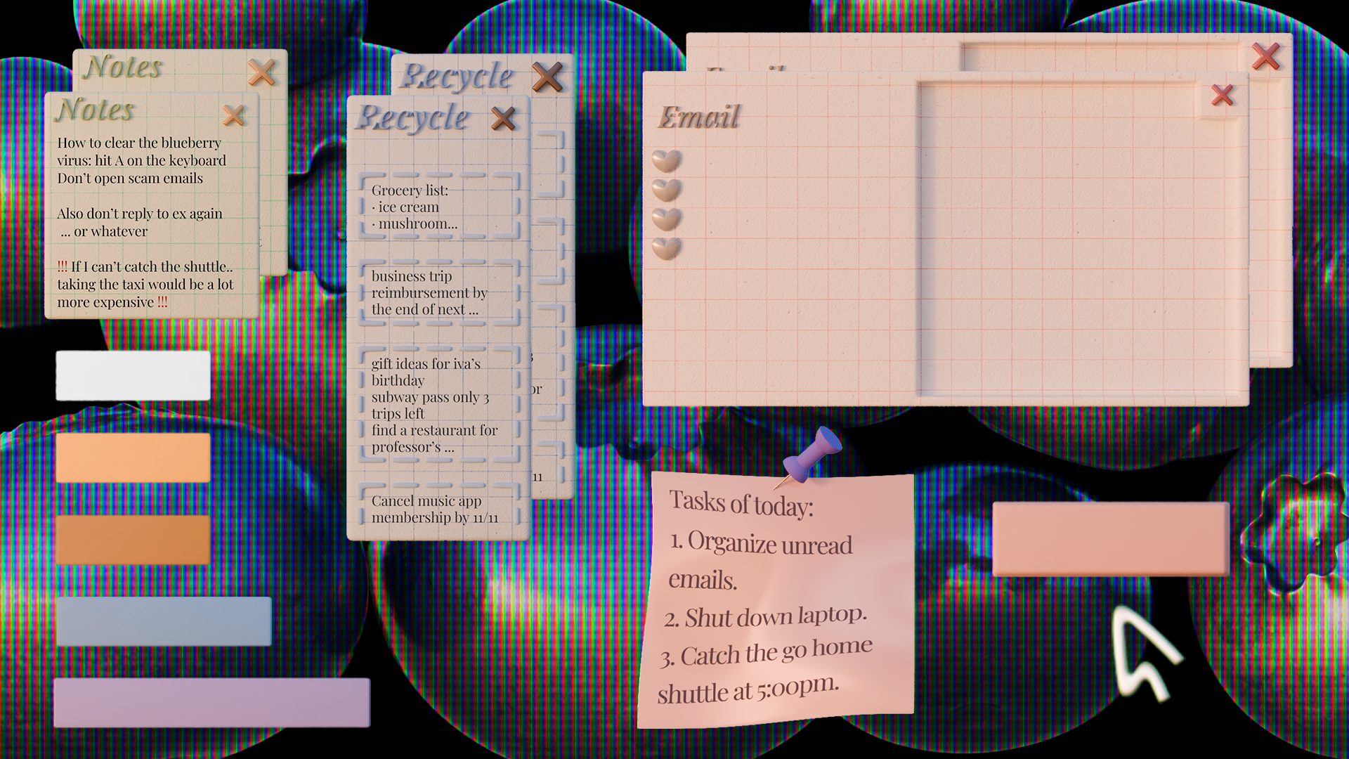 “The Last Moment of Nine to Five” is a desktop game built in Unity. The player will explore and perform tasks on a computer screen in order to complete the login – interact – shutdown process. There is a time limit to the game, but going beyond the limit does not affect the overall experience.